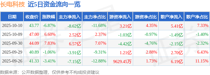 10月10日的资金流向数据方面,主力资金净流出8.62亿元,占总成交额11.68%,游资资金净流入3.21亿元,占总成交额4.35%,散户资金净流入5.41亿元,占总成交额7.33%。