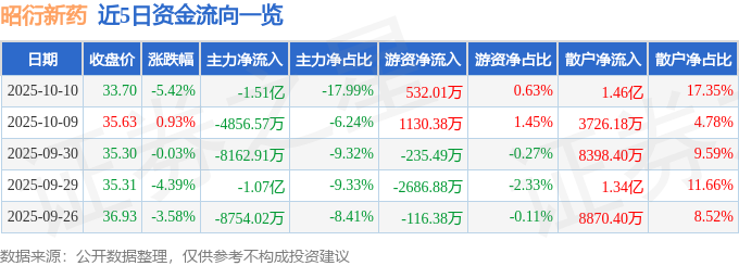 证券之星消息,截至2025年10月10日收盘,昭衍新药(603127)报收于33.7元,下跌5.42%,换手率3.91%,成交量24.63万手,成交额8.41亿元。