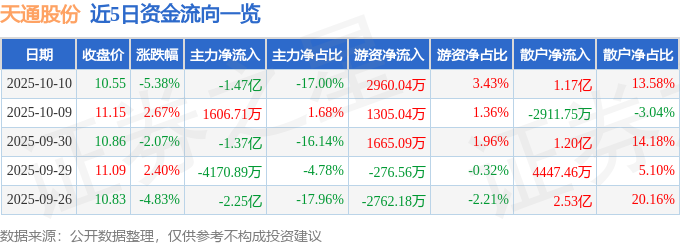 证券之星消息,截至2025年10月10日收盘,天通股份(600330)报收于10.55元,下跌5.38%,换手率6.53%,成交量80.57万手,成交额8.64亿元。