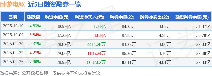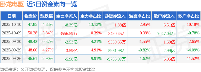 证券之星消息,截至2025年10月10日收盘,卧龙电驱(600580)报收于47.85元,下跌4.83%,换手率8.4%,成交量131.18万手,成交额63.93亿元。