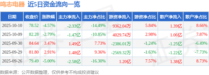10月10日的资金流向数据方面,主力资金净流出2.33亿元,占总成交额14.49%,游资资金净流入9362.04万元,占总成交额5.84%,散户资金净流入1.39亿元,占总成交额8.66%。