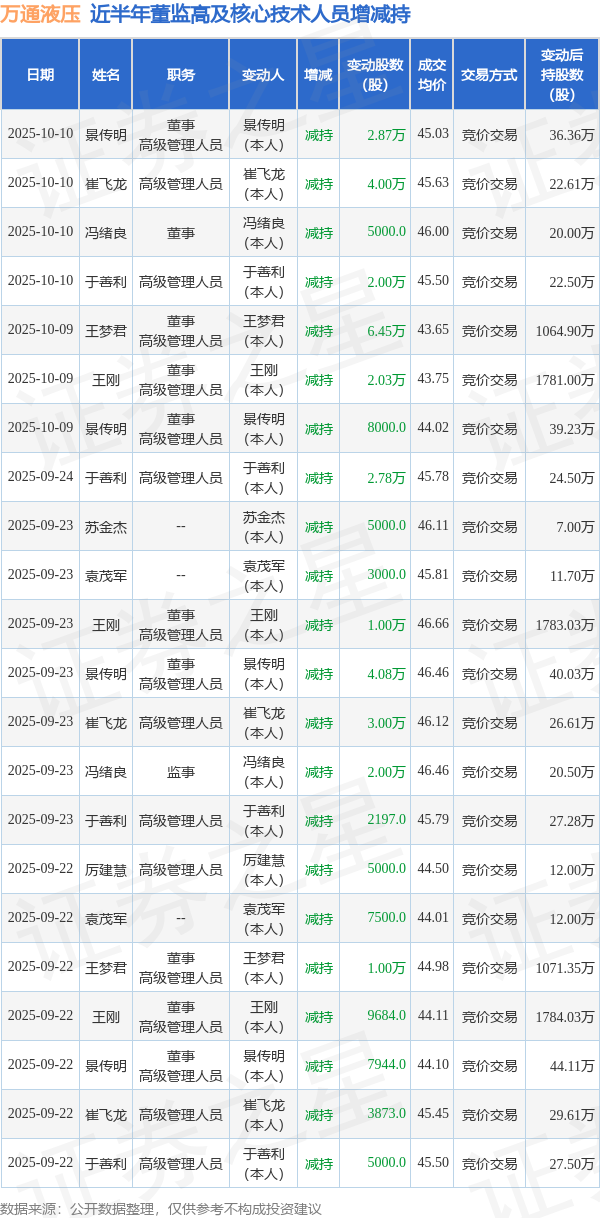 万通液压近半年内的董监高及核心技术人员增减持详情如下: