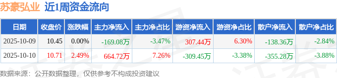 资金流向数据方面,本周苏豪弘业主力资金合计净流入495.65万元,游资资金合计净流出2.01万元,散户资金合计净流出493.64万元。本周资金流向一览见下表:
