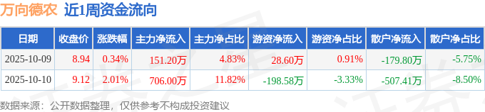 资金流向数据方面,本周万向德农主力资金合计净流入857.19万元,游资资金合计净流出169.98万元,散户资金合计净流出687.21万元。本周资金流向一览见下表:
