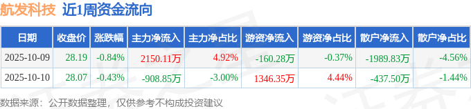 资金流向数据方面,本周航发科技主力资金合计净流入1241.26万元,游资资金合计净流入1186.06万元,散户资金合计净流出2427.32万元。本周资金流向一览见下表: