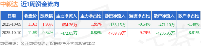 资金流向数据方面,本周中毅达主力资金合计净流入181.41万元,游资资金合计净流入4526.64万元,散户资金合计净流出4708.05万元。本周资金流向一览见下表: