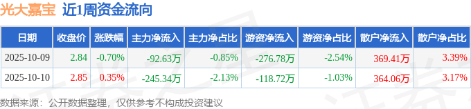 资金流向数据方面,本周光大嘉宝主力资金合计净流出337.98万元,游资资金合计净流出395.49万元,散户资金合计净流入733.47万元。本周资金流向一览见下表: