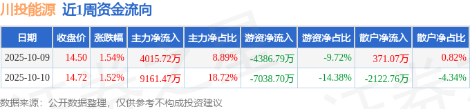资金流向数据方面,本周川投能源主力资金合计净流入1.32亿元,游资资金合计净流出1.14亿元,散户资金合计净流出1751.69万元。本周资金流向一览见下表: