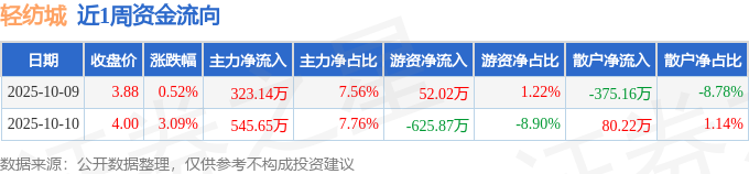 沪深股通持股方面,截止2025年10月10日收盘,轻纺城沪股通持股数为509.83万股,占流通股比为35.0%。