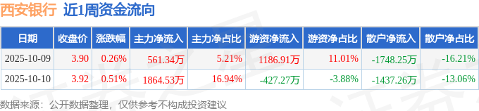 资金流向数据方面,本周西安银行主力资金合计净流入2425.87万元,游资资金合计净流入759.63万元,散户资金合计净流出3185.51万元。本周资金流向一览见下表: