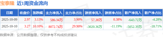 沪深股通持股方面,截止2025年10月10日收盘,宝泰隆沪股通持股数为1410.55万股,占流通股比为74.0%。