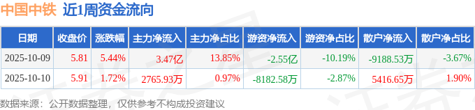 沪深股通持股方面,截止2025年10月10日收盘,中国中铁沪股通持股数为5.99亿股,占流通股比为293.0%。