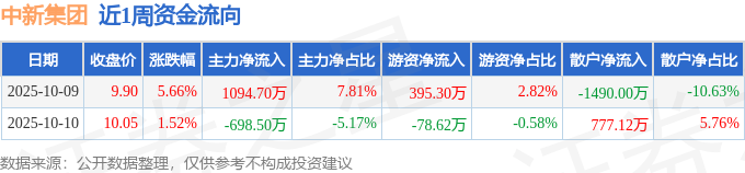 资金流向数据方面,本周中新集团主力资金合计净流入396.2万元,游资资金合计净流入316.68万元,散户资金合计净流出712.88万元。本周资金流向一览见下表: