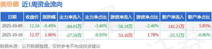 资金流向数据方面,本周美思德主力资金合计净流出111.61万元,游资资金合计净流出5.08万元,散户资金合计净流入116.7万元。本周资金流向一览见下表:
