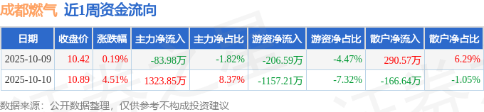 资金流向数据方面,本周成都燃气主力资金合计净流入1239.87万元,游资资金合计净流出1363.8万元,散户资金合计净流入123.93万元。本周资金流向一览见下表: