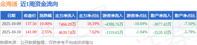 资金流向数据方面,本周金海通主力资金合计净流入1.21亿元,游资资金合计净流出5508.41万元,散户资金合计净流出6597.53万元。本周资金流向一览见下表: