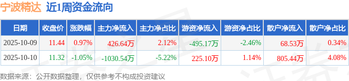 资金流向数据方面,本周宁波精达主力资金合计净流出603.9万元,游资资金合计净流出270.06万元,散户资金合计净流入873.96万元。本周资金流向一览见下表:
