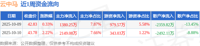 资金流向数据方面,本周云中马主力资金合计净流入3529.34万元,游资资金合计净流入1322.59万元,散户资金合计净流出4851.93万元。本周资金流向一览见下表: