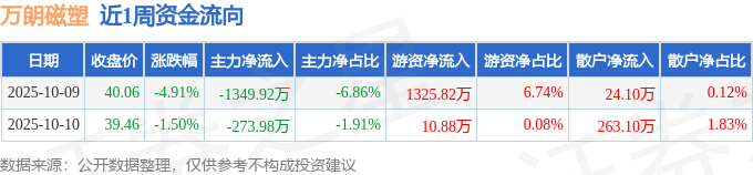 资金流向数据方面,本周万朗磁塑主力资金合计净流出1623.89万元,游资资金合计净流入1336.69万元,散户资金合计净流入287.2万元。本周资金流向一览见下表: