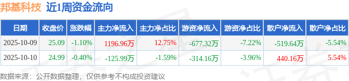 资金流向数据方面,本周邦基科技主力资金合计净流入1070.97万元,游资资金合计净流出991.48万元,散户资金合计净流出79.49万元。本周资金流向一览见下表: