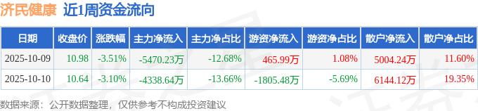 资金流向数据方面,本周济民健康主力资金合计净流出9808.88万元,游资资金合计净流出1339.49万元,散户资金合计净流入1.11亿元。本周资金流向一览见下表: