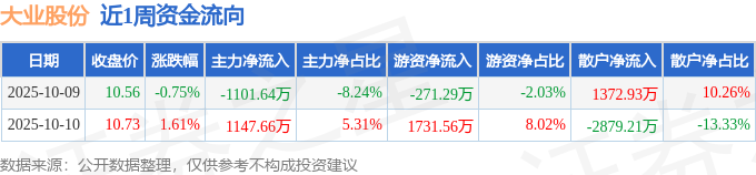资金流向数据方面,本周大业股份主力资金合计净流入46.02万元,游资资金合计净流入1460.27万元,散户资金合计净流出1506.28万元。本周资金流向一览见下表: