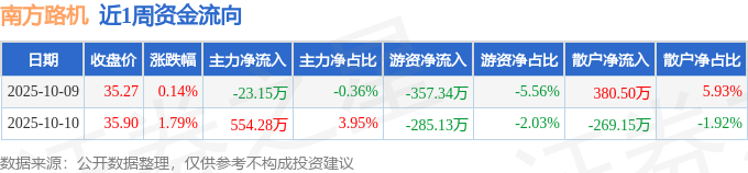 资金流向数据方面,本周南方路机主力资金合计净流入531.13万元,游资资金合计净流出642.47万元,散户资金合计净流入111.34万元。本周资金流向一览见下表: