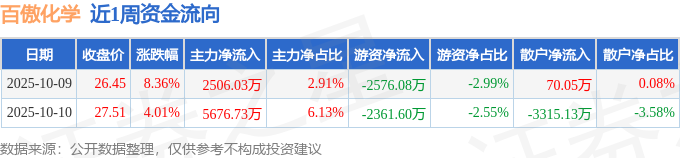 资金流向数据方面,本周百傲化学主力资金合计净流入8182.76万元,游资资金合计净流出4937.68万元,散户资金合计净流出3245.08万元。本周资金流向一览见下表: