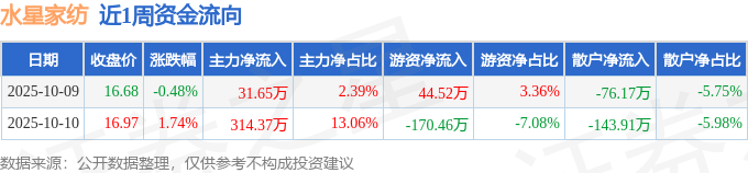 资金流向数据方面,本周水星家纺主力资金合计净流入346.02万元,游资资金合计净流出125.94万元,散户资金合计净流出220.08万元。本周资金流向一览见下表: