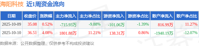 资金流向数据方面,本周海阳科技主力资金合计净流入1085.95万元,游资资金合计净流入37.25万元,散户资金合计净流出1123.2万元。本周资金流向一览见下表: