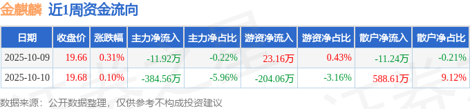 资金流向数据方面,本周金麒麟主力资金合计净流出396.47万元,游资资金合计净流出180.9万元,散户资金合计净流入577.37万元。本周资金流向一览见下表: