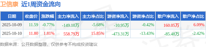 资金流向数据方面,本周卫信康主力资金合计净流入409.69万元,游资资金合计净流出484.26万元,散户资金合计净流入74.57万元。本周资金流向一览见下表: