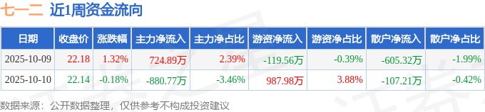资金流向数据方面,本周七一二主力资金合计净流出155.88万元,游资资金合计净流入868.41万元,散户资金合计净流出712.53万元。本周资金流向一览见下表: