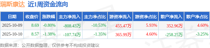 资金流向数据方面,本周瑞斯康达主力资金合计净流出916.17万元,游资资金合计净流入821.46万元,散户资金合计净流入94.71万元。本周资金流向一览见下表: