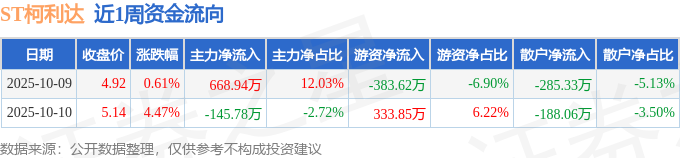 资金流向数据方面,本周ST柯利达主力资金合计净流入523.16万元,游资资金合计净流出49.77万元,散户资金合计净流出473.39万元。本周资金流向一览见下表: