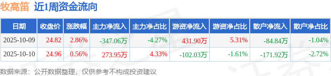 资金流向数据方面,本周牧高笛主力资金合计净流出73.1万元,游资资金合计净流入329.87万元,散户资金合计净流出256.77万元。本周资金流向一览见下表: