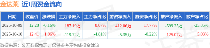 资金流向数据方面,本周金达莱主力资金合计净流入67.47万元,游资资金合计净流入406.71万元,散户资金合计净流出474.18万元。本周资金流向一览见下表: