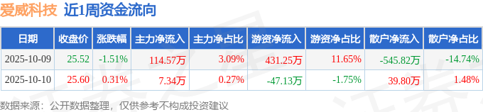 资金流向数据方面,本周爱威科技主力资金合计净流入121.91万元,游资资金合计净流入384.11万元,散户资金合计净流出506.02万元。本周资金流向一览见下表: