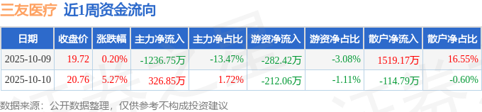 资金流向数据方面,本周三友医疗主力资金合计净流出909.91万元,游资资金合计净流出494.48万元,散户资金合计净流入1404.39万元。本周资金流向一览见下表: