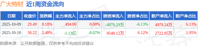 资金流向数据方面,本周广大特材主力资金合计净流出1.13亿元,游资资金合计净流入3560.83万元,散户资金合计净流入7702.1万元。本周资金流向一览见下表: