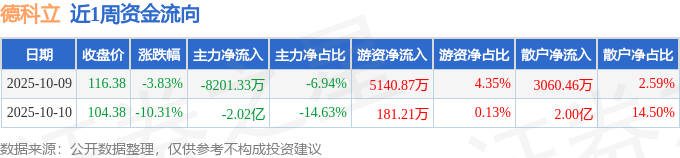 资金流向数据方面,本周德科立主力资金合计净流出2.84亿元,游资资金合计净流入5322.08万元,散户资金合计净流入2.31亿元。本周资金流向一览见下表: