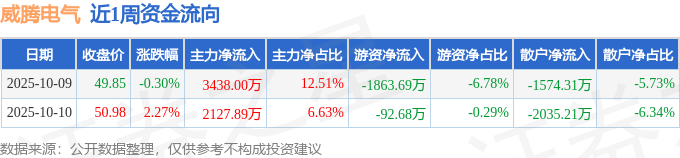 资金流向数据方面,本周威腾电气主力资金合计净流入5565.89万元,游资资金合计净流出1956.37万元,散户资金合计净流出3609.52万元。本周资金流向一览见下表: