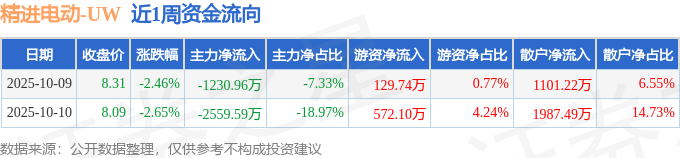 资金流向数据方面,本周精进电动主力资金合计净流出3790.55万元,游资资金合计净流入701.84万元,散户资金合计净流入3088.71万元。本周资金流向一览见下表: