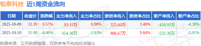资金流向数据方面,本周钜泉科技主力资金合计净流出260.98万元,游资资金合计净流入1212.27万元,散户资金合计净流出951.3万元。本周资金流向一览见下表: