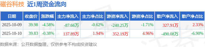 资金流向数据方面,本周磁谷科技主力资金合计净流入50.23万元,游资资金合计净流入111.94万元,散户资金合计净流出162.17万元。本周资金流向一览见下表:
