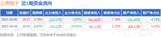 资金流向数据方面,本周上声电子主力资金合计净流出964.78万元,游资资金合计净流入923.16万元,散户资金合计净流入41.62万元。本周资金流向一览见下表:
