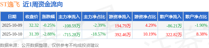 资金流向数据方面,本周ST逸飞主力资金合计净流出823.86万元,游资资金合计净流入587.25万元,散户资金合计净流入236.61万元。本周资金流向一览见下表: