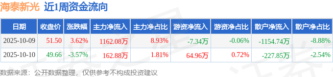 资金流向数据方面,本周海泰新光主力资金合计净流入1324.96万元,游资资金合计净流入57.62万元,散户资金合计净流出1382.58万元。本周资金流向一览见下表: