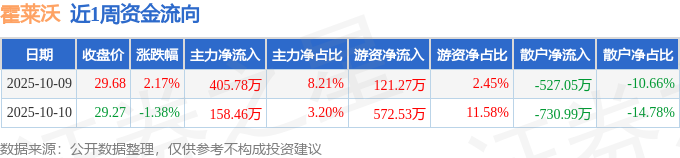 资金流向数据方面,本周霍莱沃主力资金合计净流入564.24万元,游资资金合计净流入693.8万元,散户资金合计净流出1258.04万元。本周资金流向一览见下表: