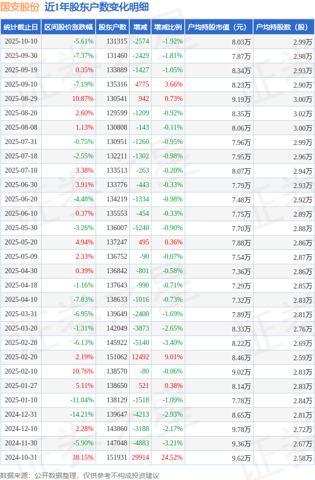 证券之星消息,近日国安股份披露,截至2025年10月10日公司股东户数为13.13万户,较9月19日减少2574.0户,减幅为1.92%。户均持股数量由上期的2.98万股增加至2.99万股,户均持股市值为8.03万元。